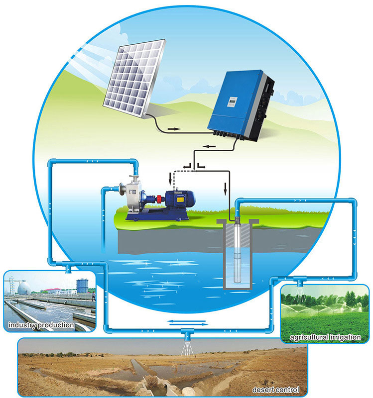 The solar pumping inverter converter the DC from solar panels to AC to drive pump to work. The pump will pump the water from borehole, lake, river etc. to the storage. The main application of the solar pumping system are domestic water, agricultural irrigation, desert control, pasture animal husbandry, rural town water supply and so on.The solar pumping system fulfills concept of low carbon, energy conservation, environmental protection, to improve the living standard in water-deficient area.